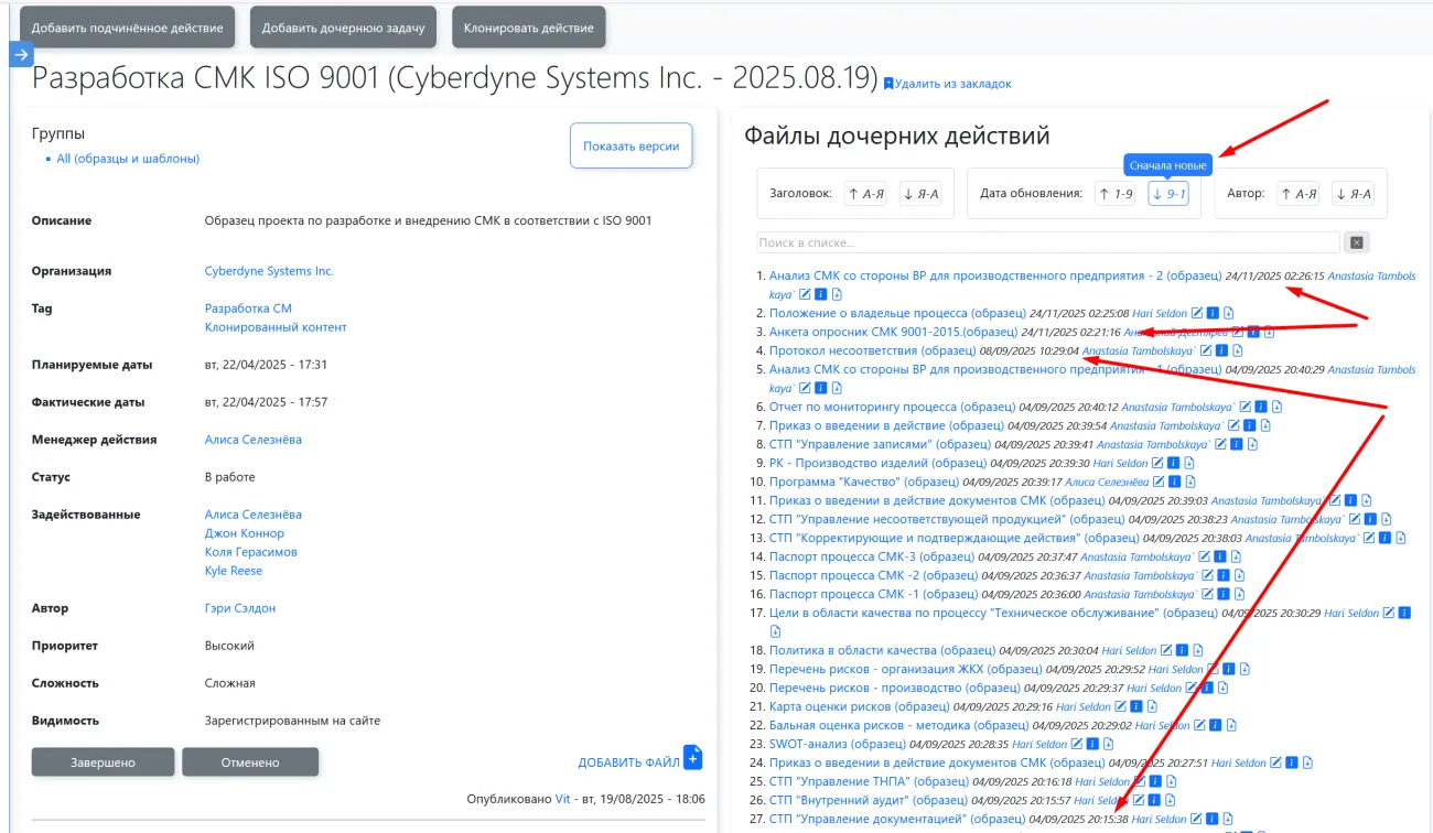Файлы теперь можно сортировать по заголовку файла (алфавитный порядок), дате обновления (порядок датирования) и по автору (алфавитный порядок). Кроме того теперь работает поиск по заголовку файла с автоматической обработкой запроса - в блоке отображения файлов остаются только те файлы, в заголовках которых содержится сочетание символов , введенных в строке поиска.