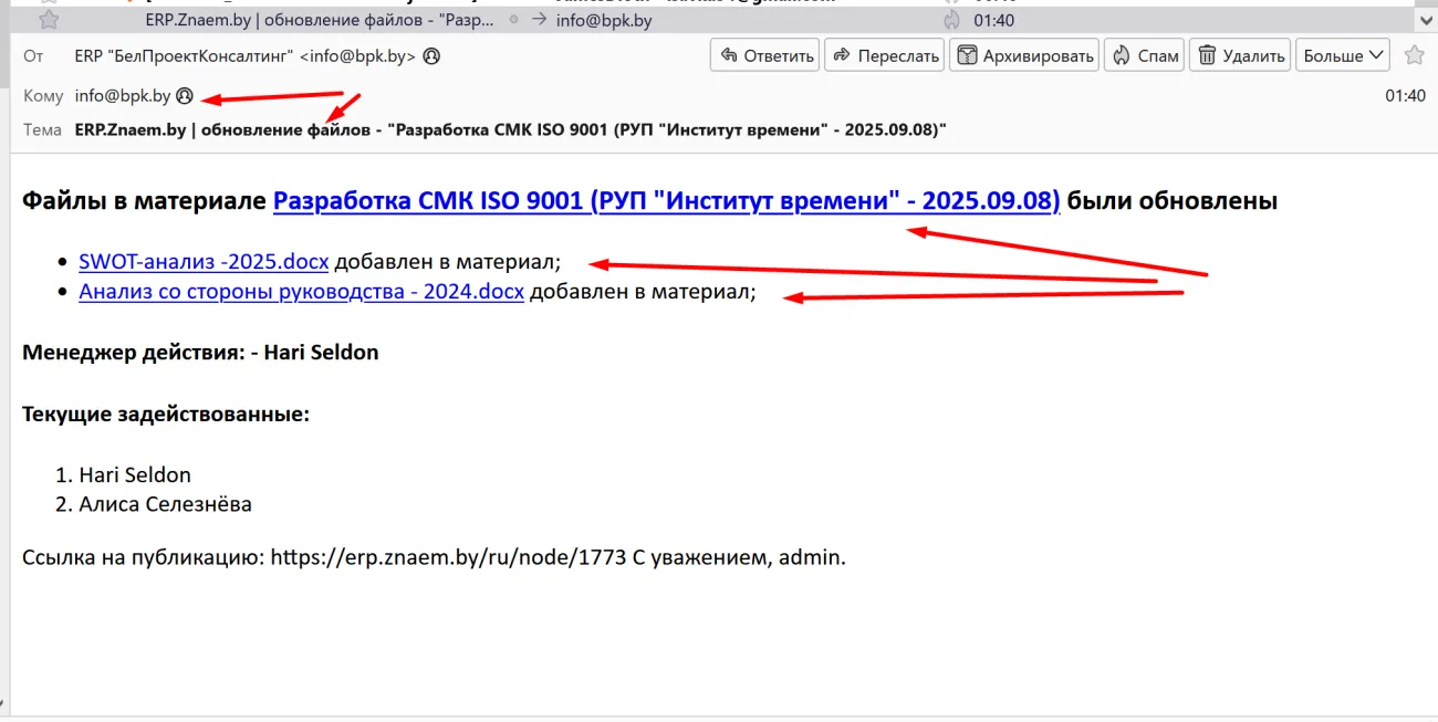 На сайте ERP.Znaem.by опубликована подробная техническая инструкция, посвящённая работе с системой email-уведомлений. Инструкция описывает, как в системе настраивается автоматическое информирование пользователей о ключевых изменениях в действиях, задачах, проектах и других типах контента. Инструкция помогает разобраться в логике уведомлений и показывает, как использовать этот функционал для повышения командной информированности и упорядочивания обмена информацией. Email-уведомления позволяют участникам процессов своевременно получать информацию об изменениях без необходимости дополнительной пересылки данных.