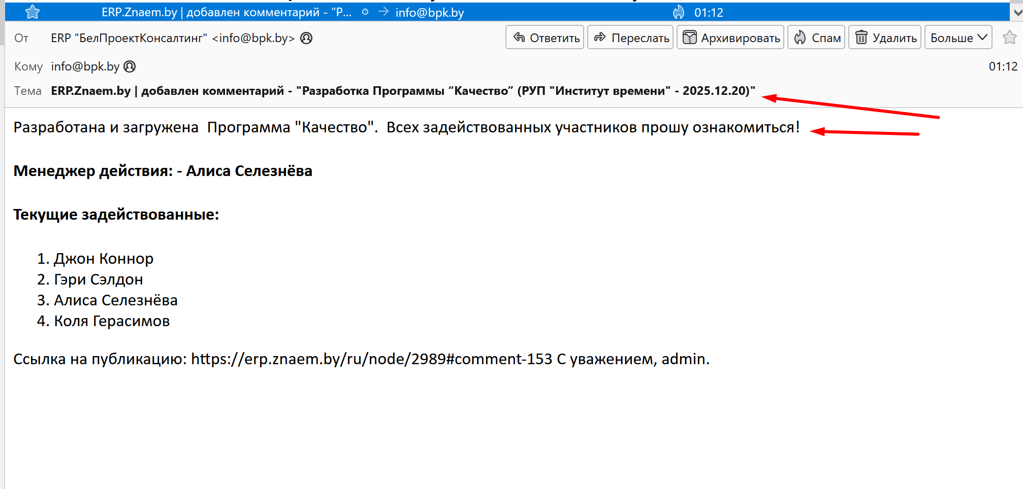 На сайте ERP.Znaem.by опубликована подробная техническая инструкция, посвящённая работе с системой email-уведомлений. Инструкция описывает, как в системе настраивается автоматическое информирование пользователей о ключевых изменениях в действиях, задачах, проектах и других типах контента.