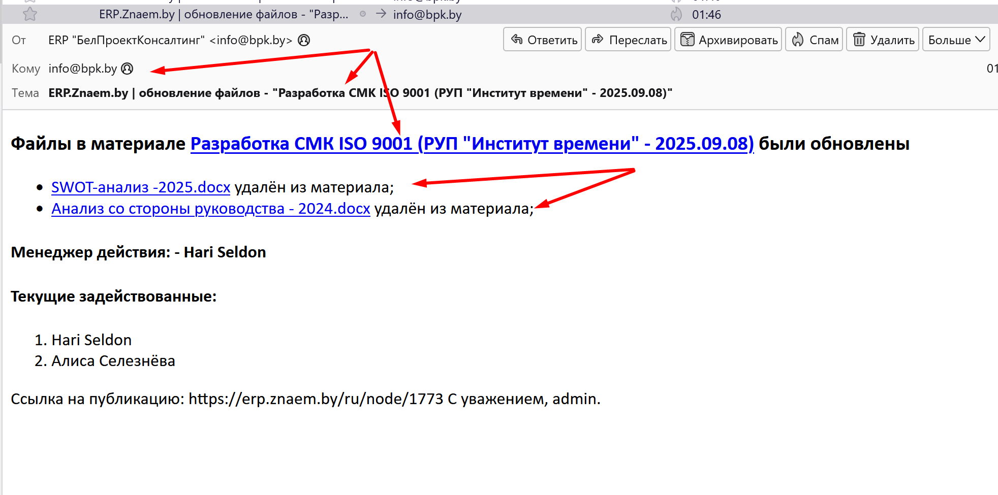 Описан механизм уведомлений при работе с файлами: система автоматически информирует всех задействованных пользователей о добавлении или удалении одного или нескольких файлов, включая перечень изменений прямо в письме. Это позволяет избежать дублирующих отправок файлов по почте и снижает риск потери актуальной версии документов.